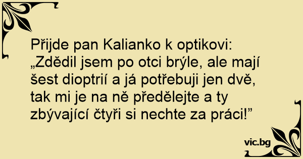 Přijde pan Kalianko k optikovi: „Zdědil jsem po otci brýle, ale mají šest dioptrií a já potřebuji jen dvě, tak mi je na ně předělejte a ty zbývající čtyři si nechte za práci!”