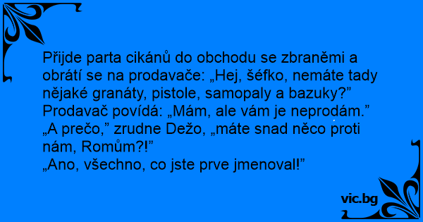 Přijde parta cikánů do obchodu se zbraněmi a obrátí se na prodavače: „Hej, šéfko, nemáte tady nějaké granáty, pistole, samopaly a bazuky?”