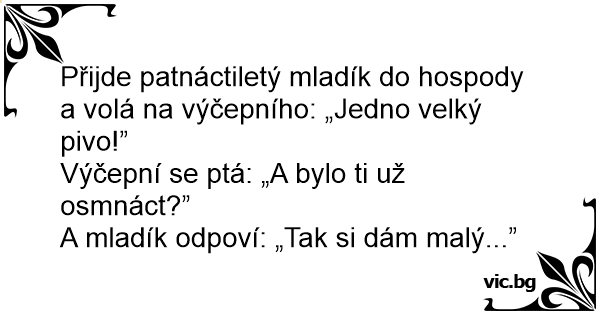 Přijde patnáctiletý mladík do hospody a volá na výčepního: „Jedno velký pivo!”