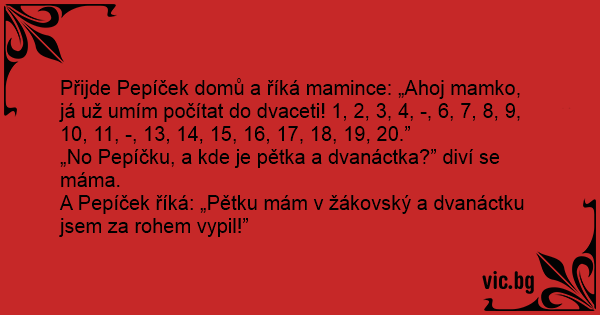 Přijde Pepíček domů a říká mamince: „Ahoj mamko, já už umím počítat do dvaceti! 1, 2, 3, 4, -, 6, 7, 8, 9, 10, 11, -, 13, 14, 15, 16, 17, 18, 19, 20.”