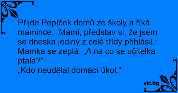 Přijde Pepíček domů ze školy a říká mamince: „Mami, představ si, že jsem se dneska jediný z celé třídy přihlásil.”