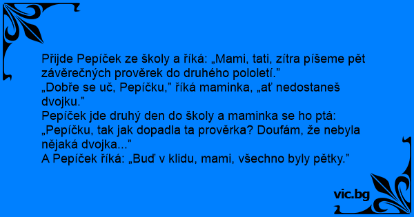 Přijde Pepíček ze školy a říká: „Mami, tati, zítra píšeme pět závěrečných prověrek do druhého pololetí.”
