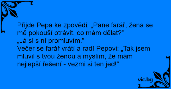 Večer se farář vrátí a radí Pepovi: „Tak jsem mluvil s tvou ženou a myslím, že mám nejlepší řešení - vezmi si ten jed!”