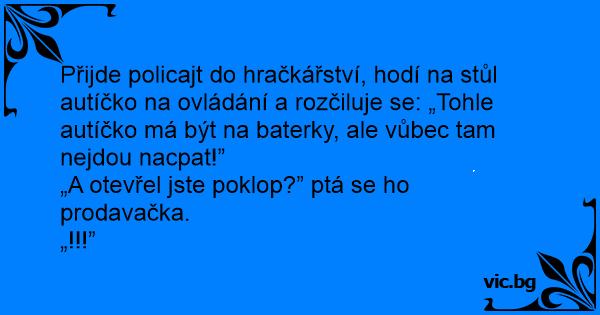 Přijde policajt do hračkářství, hodí na stůl autíčko na ovládání a rozčiluje se: „Tohle autíčko má být na baterky, ale vůbec tam nejdou nacpat!”