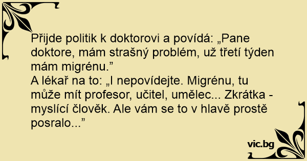 Přijde politik k doktorovi a povídá: „Pane doktore, mám strašný problém, už třetí týden mám migrénu.”