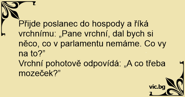 Přijde poslanec do hospody a říká vrchnímu: „Pane vrchní, dal bych si něco, co v parlamentu nemáme. Co vy na to?”