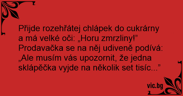 Přijde rozehřátej chlápek do cukrárny a má velké oči: „Horu zmrzliny!”