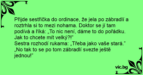 Přijde sestřička do ordinace, že jela po zábradlí a roztrhla si to mezi nohama. Doktor se jí tam podívá a říká: „To nic není, dáme to do pořádku. Jak to chcete mít velký?!”