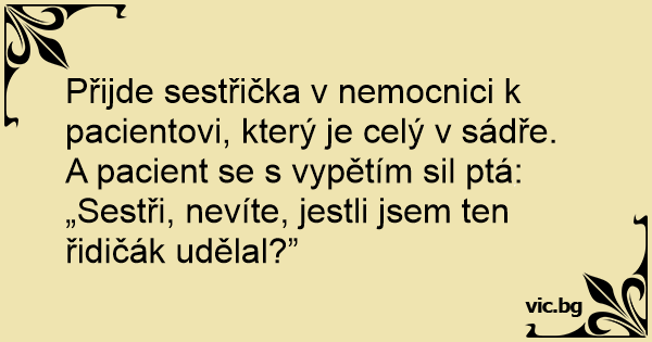 Přijde sestřička v nemocnici k pacientovi, který je celý v sádře. A pacient se s vypětím sil ptá: „Sestři, nevíte, jestli jsem ten řidičák udělal?”