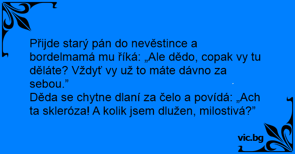 Přijde starý pán do nevěstince a bordelmamá mu říká: „Ale dědo, copak vy tu děláte? Vždyť vy už to máte dávno za sebou.”