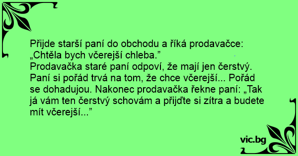 Prodavačka staré paní odpoví, že mají jen čerstvý. Paní si pořád trvá na tom, že chce včerejší... Pořád se dohadujou. Nakonec prodavačka řekne paní: „Tak já vám ten čerstvý schovám a přijďte si zítra a budete mít včerejší...”