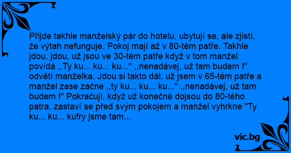 Přijde takhle manželský pár do hotelu, ubytují se, ale zjistí, že výtah nefunguje. Pokoj mají až v 80-tém patře. Takhle jdou, jdou, už jsou ve 30-tém patře když v tom manžel povídá ,,Ty ku... ku... ku..." ,,nenadávej, už tam budem !" odvětí manželka. Jdou si takto dál, už jsem v 65-tém patře a manžel zase začne ,,ty ku... ku... ku..." ,,nenadávej, už tam budem !" Pokračují, když už konečně dojsou do 80-tého patra, zastaví se před svým pokojem a manžel vyhrkne "Ty ku... ku... kufry jsme tam zapomněli.