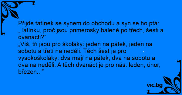 Přijde tatínek se synem do obchodu a syn se hо ptá: „Tatínku, proč jsou primerosky balené po třech, šesti a dvanácti?”