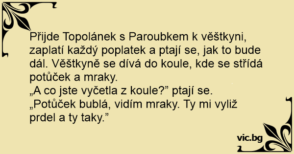 Přijde Topolánek s Paroubkem k věštkyni, zaplatí každý poplatek a ptají se, jak to bude dál. Věštkyně se dívá do koule, kde se střídá potůček a mraky.