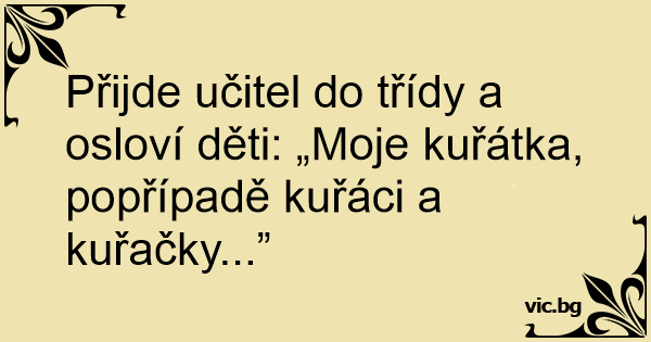 Přijde učitel do třídy a osloví děti: „Moje kuřátka, popřípadě kuřáci a kuřačky...”