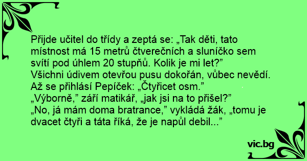 Přijde učitel do třídy a zeptá se: „Tak děti, tato místnost má 15 metrů čtverečních a sluníčko sem svítí pod úhlem 20 stupňů. Kolik je mi let?”