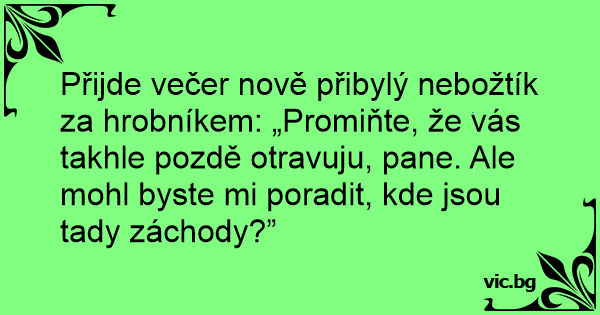 Přijde večer nově přibylý nebožtík za hrobníkem: „Promiňte, že vás takhle pozdě otravuju, pane. Ale mohl byste mi poradit, kde jsou tady záchody?”