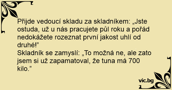 Přijde vedoucí skladu za skladníkem: „Jste ostuda, už u nás pracujete půl roku a pořád nedokážete rozeznat první jakost uhlí od druhé!”