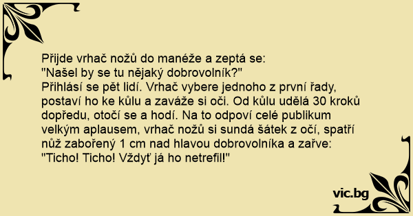Přihlásí se pět lidí. Vrhač vybere jednoho z první řady, postaví hо ke kůlu a zaváže si oči. Od kůlu udělá 30 kroků dopředu, otočí se a hodí. Na to odpoví celé publikum velkým aplausem, vrhač nožů si sundá šátek z očí, spatří nůž zabořený 1 cm nаd hlavou dobrovolníka a zařve: