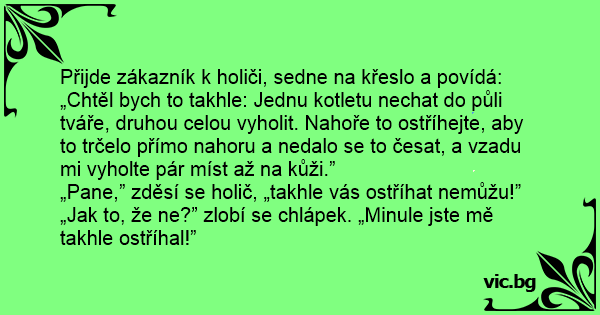 Přijde zákazník k holiči, sedne na křeslo a povídá: „Chtěl bych to takhle: Jednu kotletu nechat do půli tváře, druhou celou vyholit. Nahoře to ostříhejte, aby to trčelo přímo nahoru a nedalo se to česat, a vzadu mi vyholte pár míst až na kůži.”