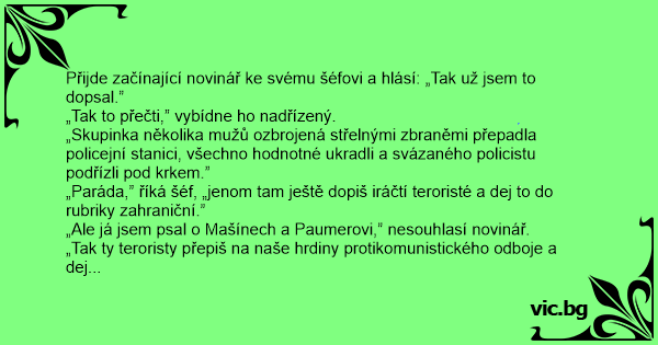 „Paráda,” říká šéf, „jenom tam ještě dopiš iráčtí teroristé a dej to do rubriky zahraniční.”