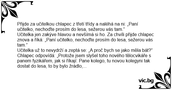 Přijde za učitelkou chlapec z třetí třídy a naléhá na ni: „Paní učitelko, nechoďte prosím do lesa, sežerou vás tam.”