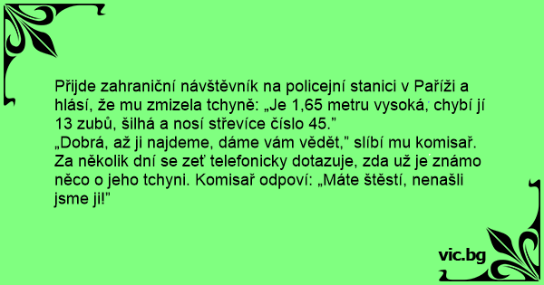 Přijde zahraniční návštěvník na policejní stanici v Paříži a hlásí, že mu zmizela tchyně: „Je 1,65 metru vysoká, chybí jí 13 zubů, šilhá a nosí střevíce číslo 45.”