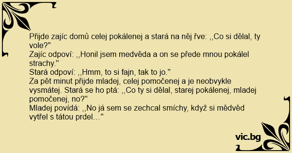 Přijde zajíc domů celej pokálenej a stará na něj řve: ,,Co si dělal, ty vole?''