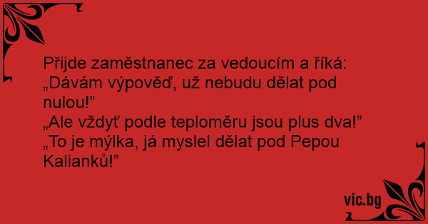 Přijde zaměstnanec za vedoucím a říká: „Dávám výpověď, už nebudu dělat pod nulou!”