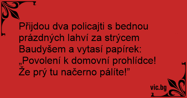 Přijdou dva policajti s bednou prázdných lahví za strýcem Baudyšem a vytasí papírek: „Povolení k domovní prohlídce! Že prý tu načerno pálíte!”