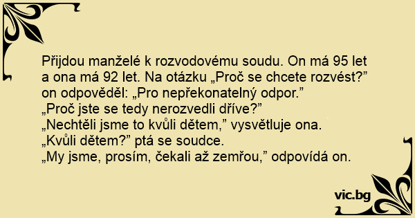 Přijdou manželé k rozvodovému soudu. On má 95 let a ona má 92 let. Na otázku „Proč se chcete rozvést?” on odpověděl: „Pro nepřekonatelný odpor.”