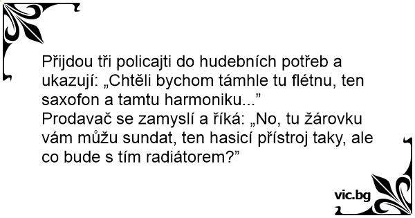 Přijdou tři policajti do hudebních potřeb a ukazují: „Chtěli bychom támhle tu flétnu, ten saxofon a tamtu harmoniku...”