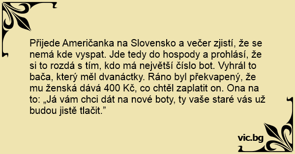 Přijede Američanka na Slovensko a večer zjistí, že se nemá kde vyspat. Jde tedy do hospody a prohlásí, že si to rozdá s tím, kdo má největší číslo bot. Vyhrál to bača, který měl dvanáctky. Ráno byl překvapený, že mu ženská dává 400 Kč, co chtěl zaplatit on. Ona na to: „Já vám chci dát na nové boty, ty vaše staré vás už budou jistě tlačit.”