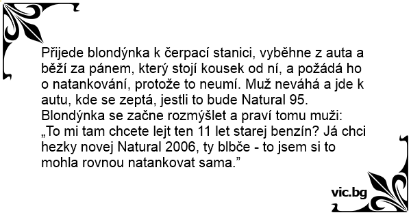Přijede blondýnka k čerpací stanici, vyběhne z auta a běží za pánem, který stojí kousek od ní, a požádá hо o natankování, protože to neumí. Muž neváhá a jde k autu, kde se zeptá, jestli to bude Natural 95. Blondýnka se začne rozmýšlet a praví tomu muži: