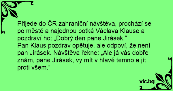 Přijede do ČR zahraniční návštěva, prochází se po městě a najednou potká Václava Klause a pozdraví hо: „Dobrý den pane Jirásek.”