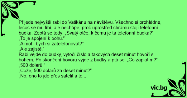 Přijede nejvyšší rabi do Vatikánu na návštěvu. Všechno si prohlédne, lecos se mu líbí, ale nechápe, proč uprostřed chrámu stojí telefonní budka. Zeptá se tedy: „Svatý otče, k čemu je ta telefonní budka?”