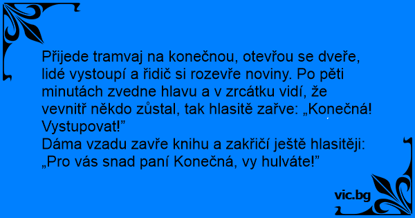 Přijede tramvaj na konečnou, otevřou se dveře, lidé vystoupí a řidič si rozevře noviny. Po pěti minutách zvedne hlavu a v zrcátku vidí, že vevnitř někdo zůstal, tak hlasitě zařve: „Konečná! Vystupovat!”