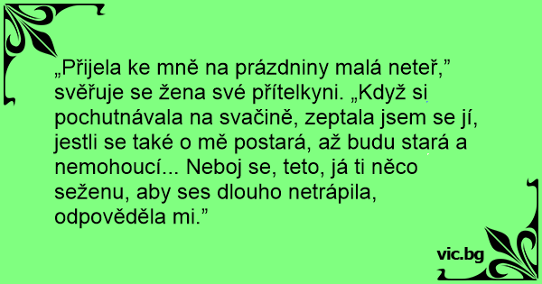 „Přijela ke mně na prázdniny malá neteř,” svěřuje se žena své přítelkyni. „Když si pochutnávala na svačině, zeptala jsem se jí, jestli se také o mě postará, až budu stará a nemohoucí... Neboj se, teto, já ti něco seženu, aby ses dlouho netrápila, odpověděla mi.”