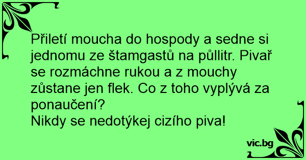 Přiletí moucha do hospody a sedne si jednomu ze štamgastů na půllitr. Pivař se rozmáchne rukou a z mouchy zůstane jen flek. Co z toho vyplývá za ponaučení?