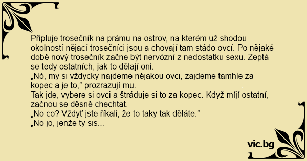 Připluje trosečník na prámu na ostrov, na kterém už shodou okolností nějací trosečníci jsou a chovají tam stádo ovcí. Po nějaké době nový trosečník začne být nervózní z nedostatku sexu. Zeptá se tedy ostatních, jak to dělají oni.
