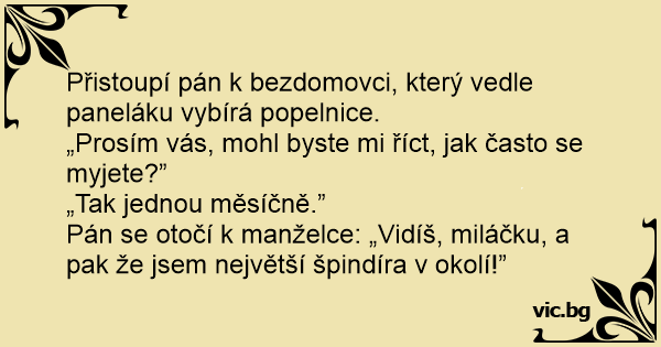 Přistoupí pán k bezdomovci, který vedle paneláku vybírá popelnice.