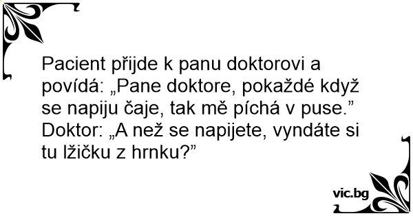 Pacient přijde k panu doktorovi a povídá: „Pane doktore, pokaždé když se napiju čaje, tak mě píchá v puse.”