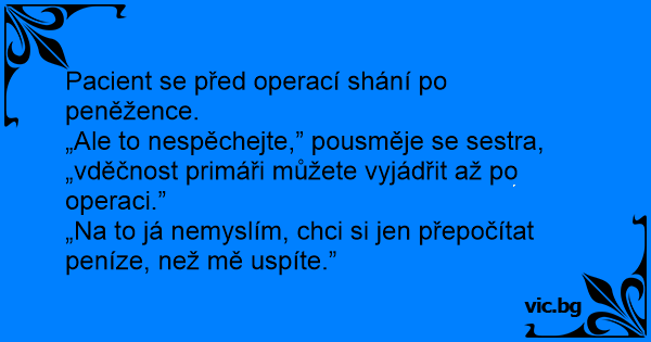 „Ale to nespěchejte,” pousměje se sestra, „vděčnost primáři můžete vyjádřit až po operaci.”