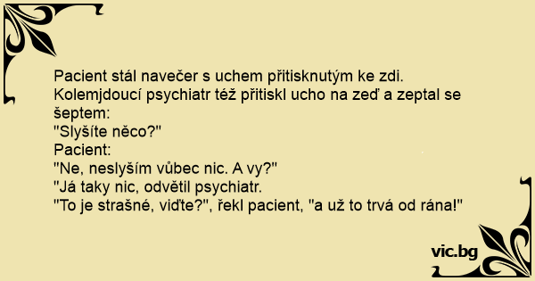 Pacient stál navečer s uchem přitisknutým ke zdi. Kolemjdoucí psychiatr též přitiskl ucho na zeď a zeptal se šeptem: