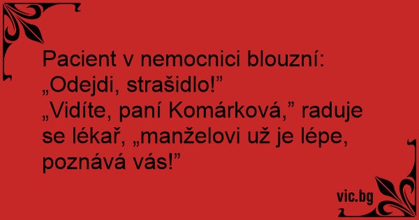 „Vidíte, paní Komárková,” raduje se lékař, „manželovi už je lépe, poznává vás!”