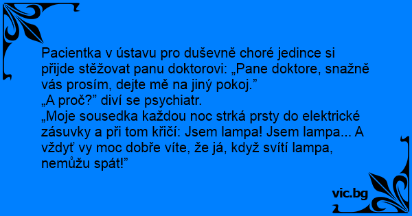 Pacientka v ústavu pro duševně choré jedince si přijde stěžovat panu doktorovi: „Pane doktore, snažně vás prosím, dejte mě na jiný pokoj.”