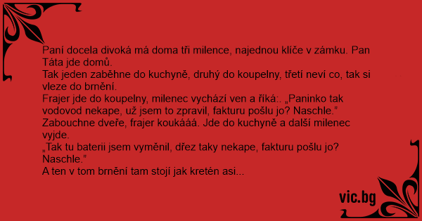 Frajer jde do koupelny, milenec vychází ven a říká:. „Paninko tak vodovod nekape, už jsem to zpravil, fakturu pošlu jo? Naschle.”