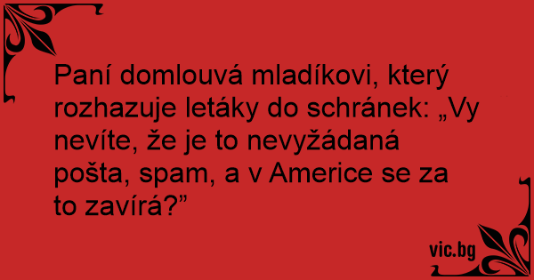 Paní domlouvá mladíkovi, který rozhazuje letáky do schránek: „Vy nevíte, že je to nevyžádaná pošta, spam, a v Americe se za to zavírá?”