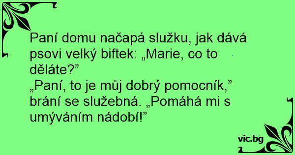„Paní, to je můj dobrý pomocník,” brání se služebná. „Pomáhá mi s umýváním nádobí!”