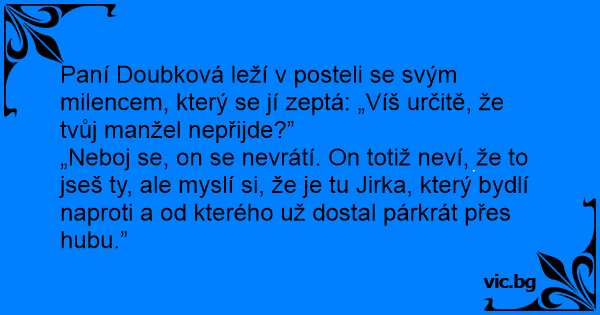 Paní Doubková leží v posteli se svým milencem, který se jí zeptá: „Víš určitě, že tvůj manžel nepřijde?”
